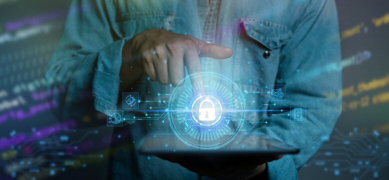 Cyber security concept. Data protection concept. Modern man using digital tablet with padlock on network security technology with cloud computing and cybersecurity.