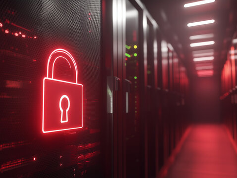 Cybersecurity concept: a padlock icon overlaid on a server room background