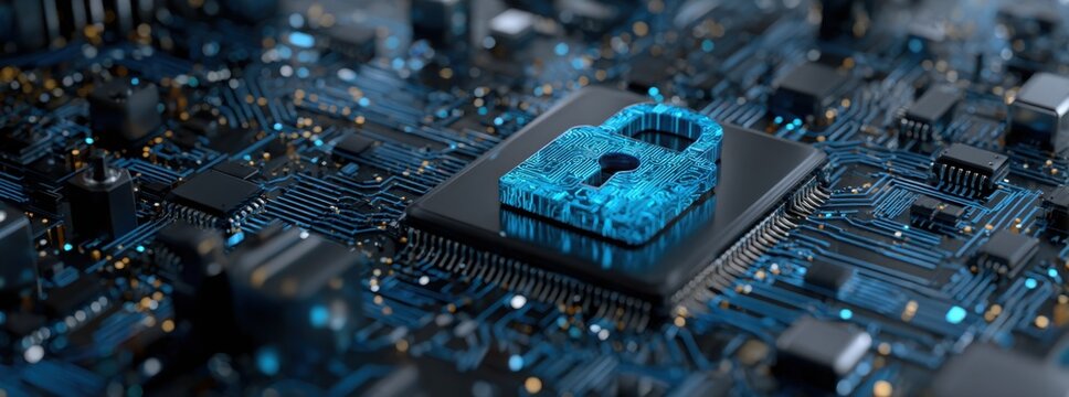 digital padlock icon on a blue digital circuit board background, representing the concept of data security protection and cyber security technology.