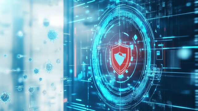 A futuristic cyber security illustration featuring a digital shield with a check mark, surrounded by code and interface elements. Perfect for representing online security, data protection, and tech.