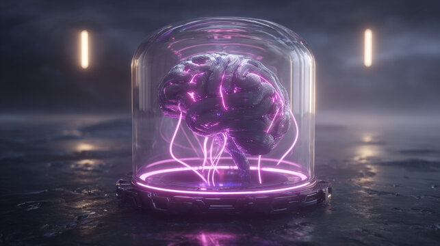 transparent shield enveloping AI brain shaped microchip pulsating neon lines concept of intellectual property protection illustration concept scene visual for commercial design use high detail quality