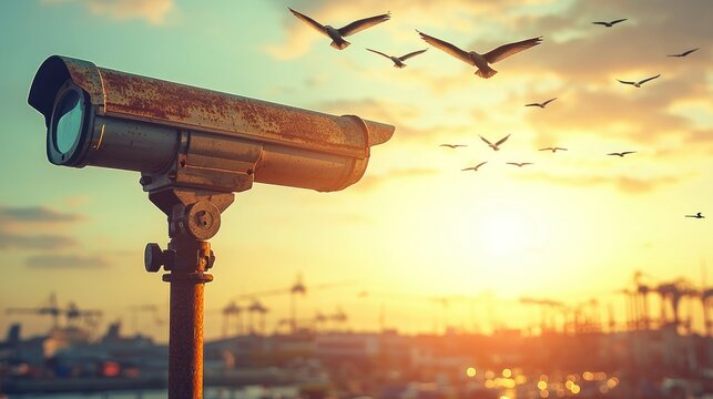 Security camera overlooking a cityscape at dusk. Surveillance technology in urban life. Camera capturing skyline, privacy and monitoring concept. Panorama with copy space.