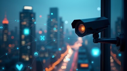 Surveillance camera overlooking futuristic cityscape at night security concept