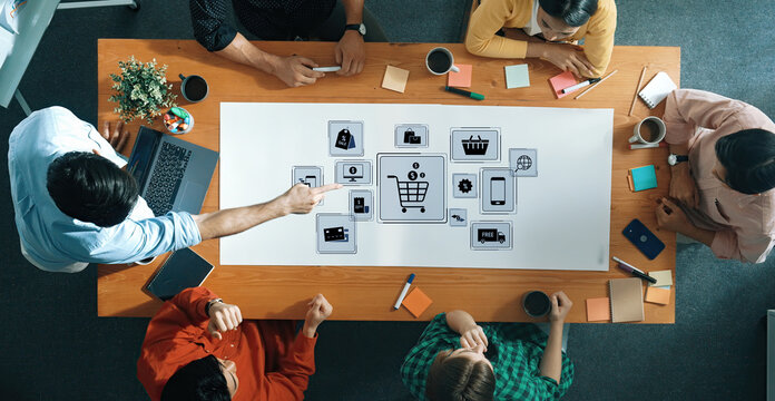 A diverse team engages in a creative brainstorming session focused on digital marketing strategy for e-commerce, surrounded by technological devices and visual aids. Trope