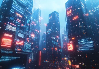 Streaming code overlays in illuminated server rack corridor with blue led glow and panels