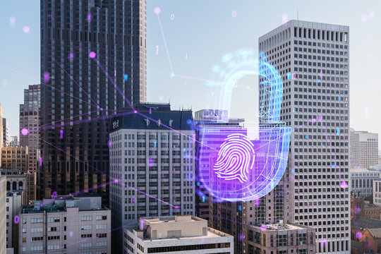 Futuristic interface scans thumb with qr code overlaying holographic grid