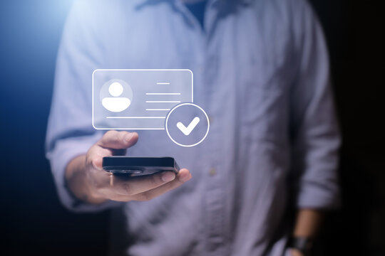 human hand holding digital identification card, with Checkmark Icons for Identity verification, ID card with checkmark. Personality approve. Employee badge.