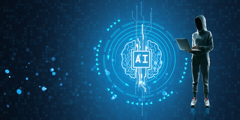 Hacker wearing hoodie with laptop and digital lock symbolizing cybersecurity
