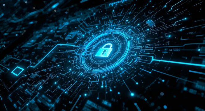 A glowing blue padlock surrounded by circuit board patterns in a dark digital environment