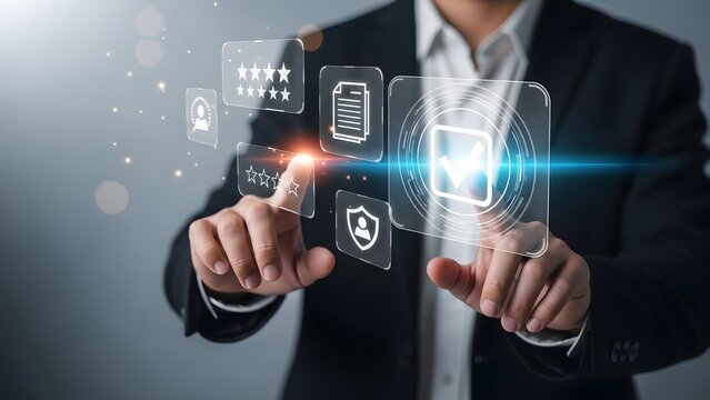 Businessman interacts with digital interface displaying network security and data protection icons using his fingertip
