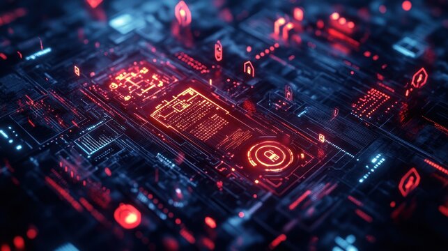 3D concept poster that visually represents the themes of data security and hacking. Incorporate elements that symbolize data theft and cyber fraud.