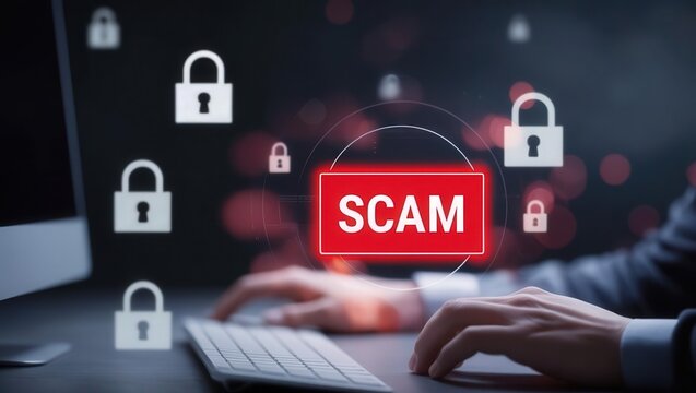 Digital red warning icon for scam over floating security icons and a person typing in a dark cybercrime theme