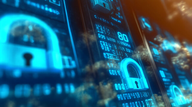 Cybersecurity, data protection, digital security concept.  Abstract futuristic glowing blue padlock icons on a digital screen with data streams. Ideal for tech, internet, and network security themes.