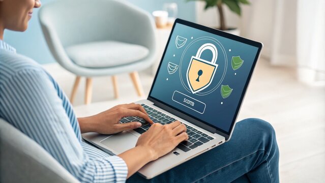 Young woman working on laptop with online security icon overlay