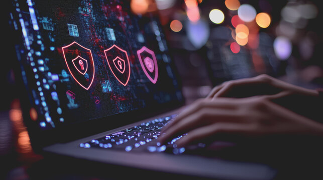 Close-up of hands typing on a laptop keyboard, featuring vibrant cyber security icons and digital effects, creating a futuristic and technological atmosphere for cyber safety themes.