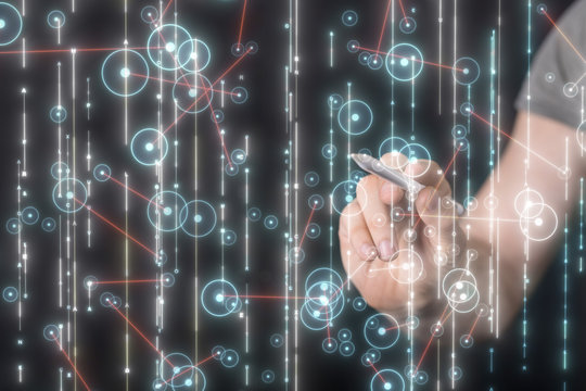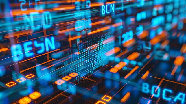 Abstract blockchain network concept with distributed ledger technology, computer connections, and blockchain text on colorful background