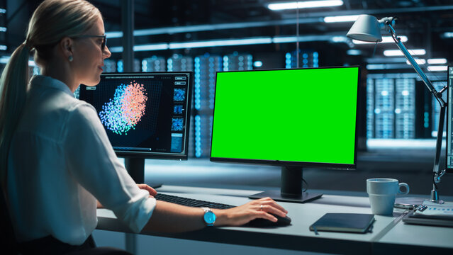 View Over the Shoulder of International Computer Scientist Develop Neural Network at her Workstation. Office with Computer with Functioning AI and Neural Data Infographics