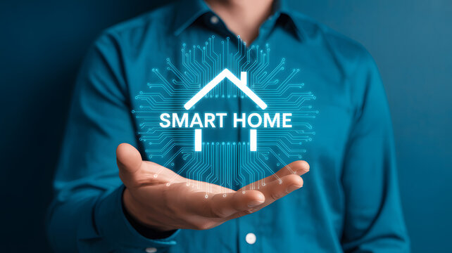 Man holding glowing smart home circuit board symbolizing future living and technology integration