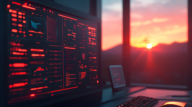 Digital interface with global network visualization and cybersecurity elements over an office desk indicating modern technology in data analysis