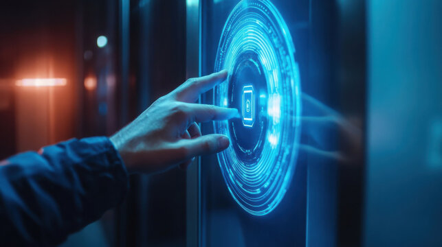 Hand interacting with a glowing blue circular holographic interface on a futuristic screen