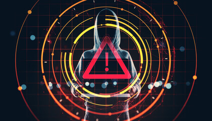 Cybersecurity warning symbol over anonymous hacker in hoodie holding laptop with digital circular interface on dark grid background.