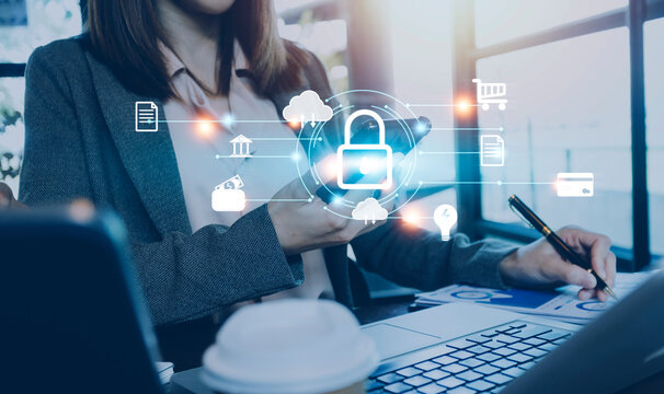 cybersecurity concept Global network security technology, business people protect personal information. Encryption with a padlock icon on the virtual interface.