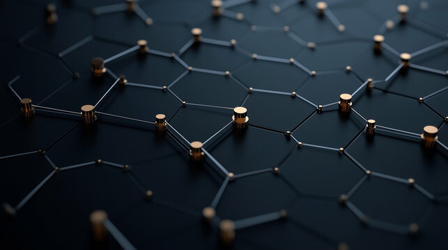 Digital Network: An abstract depiction of an interconnected digital network, represented by a series of hexagonal nodes connected by lines, symbolizing the flow of data and information.