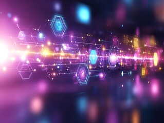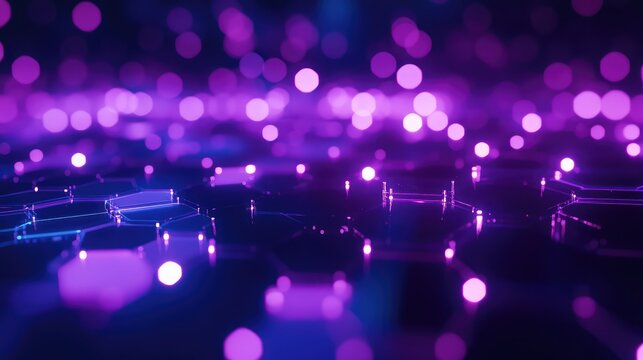 Abstract technology illustration showing network connections across a dark surface with glowing purple and blue hexagonal patterns and defocused light particles