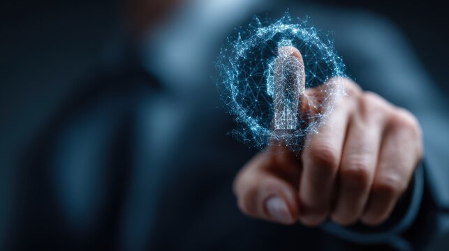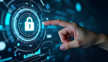 Glowing digital security interface with human finger interaction technology futuristic
