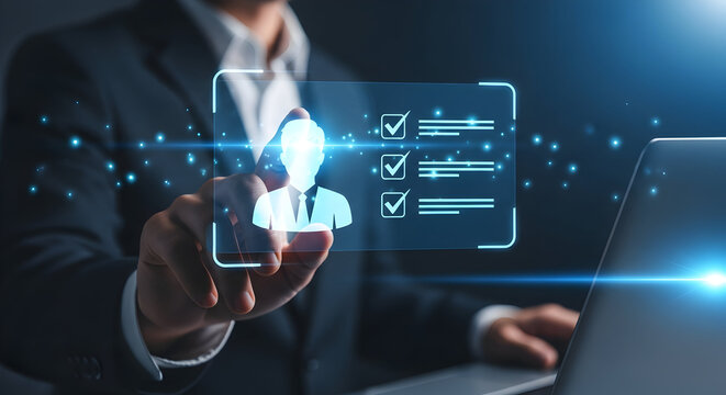 Businessman interacting with futuristic digital interface for profile verification