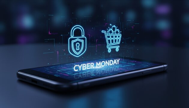 Close-up of smartphone with glowing Cyber Monday icons and blue neon light