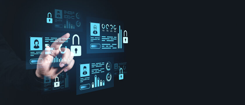 Digital interface with security icons and a hand interacting with virtual data panels.