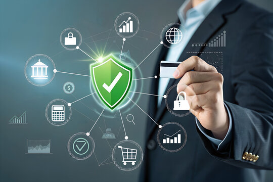 Businessman Holding Credit Card with Digital Security Shield – Secure Financial Technology and E-Commerce Protection