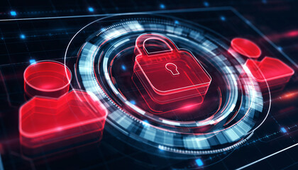 high-tech glowing lock interface in dark background, digital security access panel, sci-fi design