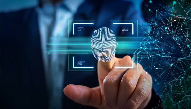 A person's finger touches a glowing fingerprint icon amid futuristic digital interfaces, symbolizing biometric security and tech integration.