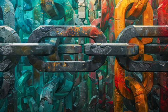Digital blockchain network with interconnected chains locks keys and shields representing security and data protection