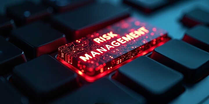 Risk management and business strategy concept. Glowing red illuminated key with circuit pattern on a dark keyboard