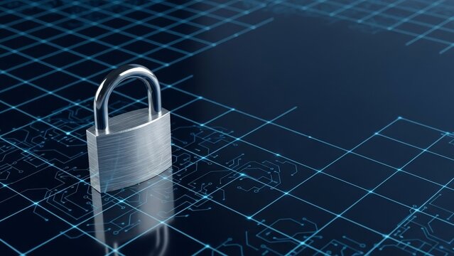 A digital lock icon on a blue and black circuit board background.
