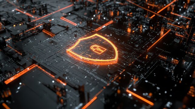Futuristic cybersecurity concept with glowing shield icon, digital lock, and circuit board background, representing data protection, network security, and advanced technology