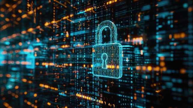 Conceptual digital security with lock icon and binary code