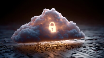 A cloud with a glowing padlock symbol over a circuit board representing secure cloud computing