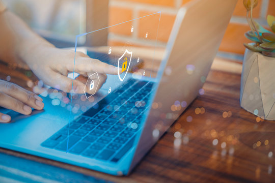 Person using a laptop computer with technology cybersecurity and privacy concept. protection and safe data for global network security