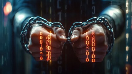 Close-up of hands bound in metal chains with digital binary code overlay symbolizing data imprisonment or cyber captivity
