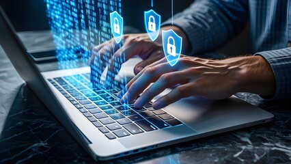 Cybersecurity concept with a glowing blue shield and padlock overlaying a person s hands typing on a laptop keyboard with a digital binary code background