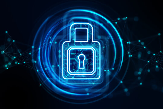 Cybersecurity concept of lock on glowing circuit board