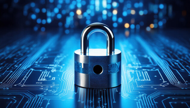 Digital padlock on circuit board symbolizes cybersecurity and safety
