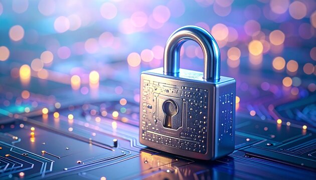 Cyber security concept with a padlock representing data protection and digital privacy on a futuristic circuit board background with glowing bokeh lights.