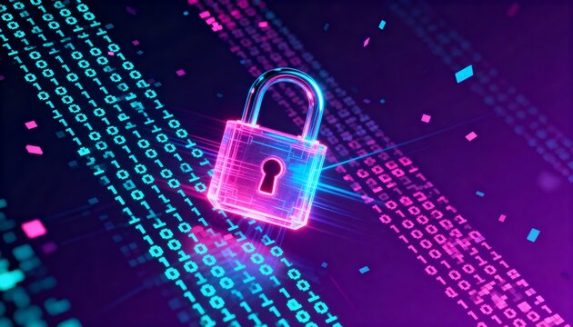 Glowing digital padlock hologram in pink and blue neon, cyber security concept, dark futuristic background with binary code