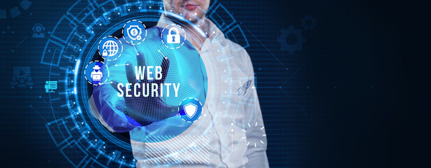 Displaying holographic cloud icon with padlock at cybersecurity dashboard, showing circular grid