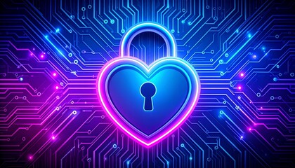 Secure digital heart with glowing neon lock on circuit board background
